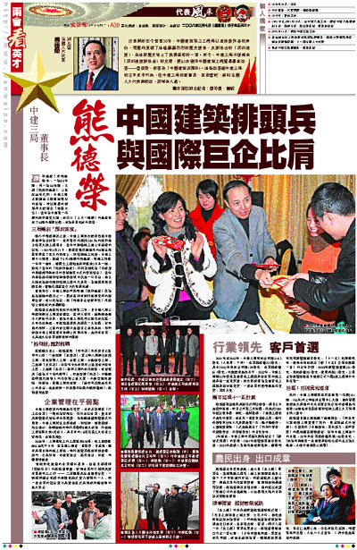 改革開放迄今整整30年,中國建築第三工程局以直接參與者的身份,經歷和見證了這場轟轟烈烈的歷史變革,其創造出的「深圳速度」,為這段歷史塗上了濃墨重彩的一筆。而今,中建三局不僅擁有「深圳速度創造者」的光環,更63次獲得中國建築工程質量最高榮譽——魯班獎,被譽為「中國建築排頭兵」。這些榮譽讓中建三局的名字炙手可熱,但中建三局的董事長、黨委書記、新科全國人大代表熊德榮,卻鮮有人識。