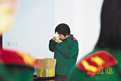 中國武警女子特警在訓練之外同樣也展露出那種小女孩的柔情。圖為特警隊員訓練間隙對戰友家寄來的化妝品倍感好奇。 中通社