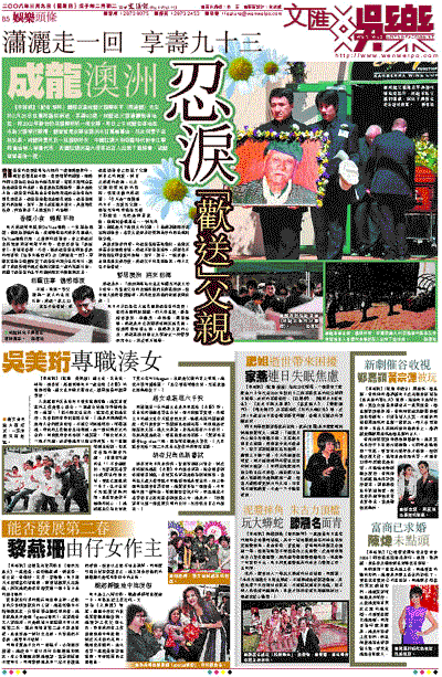 昨日不少紅星名人送花圈到龍爸爸的喪禮,包括美國前副總統、商人李嘉誠、影星湯告魯斯、李連杰、李宗盛、周華健等,成龍表示已謝絕許多朋友送花圈,但始終沒法阻止到,他感謝大家的心意。成龍在澳洲國立大學設立一所醫學研究中心,將於明天揭幕。