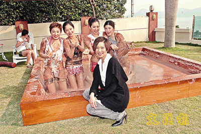 【本報訊】無線劇集《師奶股神》一班演員昨日在屯門冠峰台拍攝兩場戲,其中一場拍攝滕麗名和林嘉華欣賞泥漿摔角,並由黃瑩、曾愛媚、曾瑞珊和李穎芝合演這一幕,但因為監製不想藝員沾上真泥漿,於是想到用朱古力製作假泥漿,原來這些假泥漿價值高昂,高度每一吋要四千元,昨日所見泥漿池內的朱古力漿用上四、五吋厚。