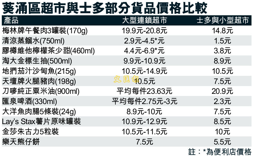 葵涌區超市與士多部分貨品價格比較 (圖)