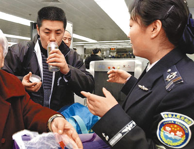 ■一名旅客在北京首都國際機場國內出港安檢通道,當著安檢人員飲用自己攜帶的茶水。 新華社