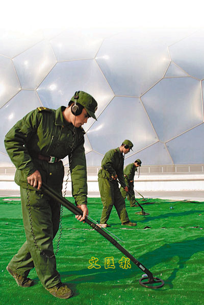 ■今年2月,解放軍工兵正對北京奧運場館「水立方」外圍實施防爆安全檢查。資料圖片