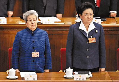 ■吳儀(左)與劉延東5日出席人大會議。資料圖片