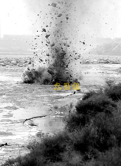 3月11日,內蒙古烏海市在黃河烏達段進行黃河流淩爆破分淩演練,以應對可能發生的黃河淩汛險情。 新華社