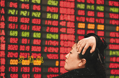 ■昨日滬深股市有1000多隻股上漲,遠多於下跌個股。然而,滬綜指幾近4000點,收市雖微升19點,但成交萎縮。圖為上海股民看著股票行情,摸不著頭腦。美聯社