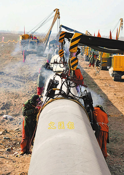 西氣東輸二線工程西起新疆霍爾果斯口岸,南至廣州,東達上海,途經新疆、甘肅、寧夏、陜西、河南、湖北、江西、湖南、廣東、廣西、浙江、上海、江蘇、安徽等14個省區市,全長9102公里。工程設計輸氣能力300億立方米/年,總投資約1420億元。西氣東輸二線管道與擬建的中亞天然氣管道相連。圖為3月10日,中國石油天然氣管道局的工程人員正在西氣東輸二線甘肅段精心施工。 新華社