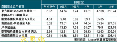 從以上種種看出,泰國的基本因素已見改善,有興趣的投資者,可考慮以基金方式投資泰國市場。現時坊間共有6隻泰國基金,當中以東方匯理CAAM系列基金—泰國基金的表現較佳,年初至今錄得5.37%的升幅。長線而言,則以成立於1989年的JF泰國基金表現較為亮麗,在過往3年及5年分別錄得79.5%及321.78%的回報,冠絕同儕;3年年度化夏普指數(Sharpe Ratio)達0.59,表現勝同類基金。 ■東驥基金管理