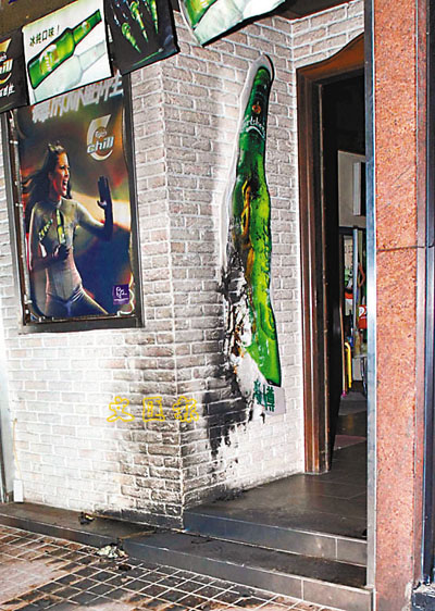 消防員及警員趕到時,火勢已被職員合力救熄。消防員發覺牆壁上一個大型啤酒廣告牌被燒焦,牆壁及行人路亦遭燻黑,並遺下2堆玻璃碎片,碎片中有一個塞有廢布碎的玻璃樽口,相信有狂徒剛投擲2枚土製燃燒彈,幸火勢並未蔓延店內,否則後果不堪設想。