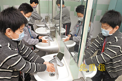 ■流感肆虐,不少學校都出盡法寶,包括要學生戴口罩及勤洗手,以預防感染。本報記者李志樑 攝