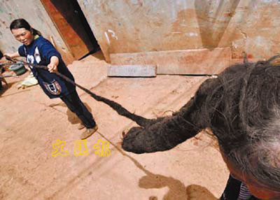 據悉,老太太10歲那年突然得了一種病,當地人叫寒氣病。她的父母請當地一個算命先生給她算了算,先生說她只要留著長髮就不會生病了。從那時起,她就開始留長髮。這辮子給她帶來的最大苦惱就是洗頭,因為辮子太長、太重,自己一個人根本沒法洗。每次洗頭都要3個人幫忙才行。因為長辮子有一段很粗,洗後不容易乾,所以每次洗頭她都要挑天晴的日子,一般要晾3天才會乾。 ■中通社