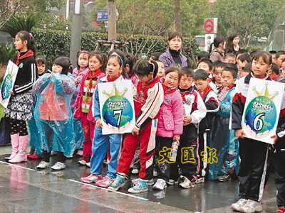 ■800名中小學生冒雨參加「和王子一起保護地球」大型公益宣傳活動。 本報記者章蘿蘭 攝
