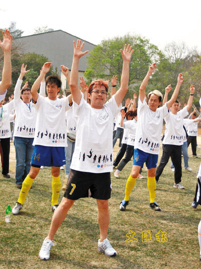 【本報訊】香港明星足球隊隊長譚詠麟及其隊員許志安、黃日華、張國強等,昨日與食物及衛生局局長周一嶽、警務處長鄧竟成等,應邀擔任「第三屆世界腎臟日在香港」典禮嘉賓,與千名腎友及家人齊跳健康舞,明星足球隊當然落場踢波。
