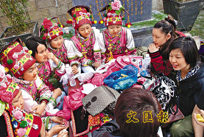■香港演藝學院的大學生正在採訪雲南巍山縣職業高中的彝族學生。本報記者蓮子 攝