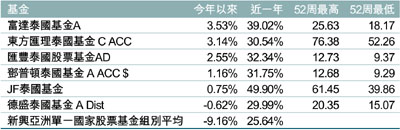 受惠泰股表現佳,泰股基金今年以來全都獲得正回報,高於東盟單一市基金組別今年以來的平均-9.16%表現。據泰國證交所公佈,在SET和MAI的掛牌公司,2007年共派發1,942億5000萬銖股息,同比上升8.26%。目前泰股在亞洲國家中有較低市盈率、股息率高以及股東權益回率高等優勢,因此泰股基金是可看高一線。