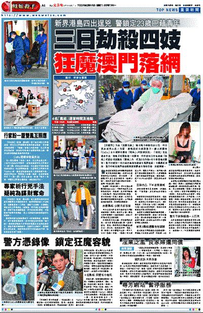 【本報訊】冷血「殺鳳狂魔」,連日馬不停蹄四出行兇,昨日更由新界北殺入市區,藉殘殺妓女挑戰警方。繼元朗鳳姐「CoCo」及大埔兩名鳳姐「阿娟」(昨誤稱莎莎)、「琪琪」先後遭毒手後,港島天后電氣道一名鳳姐,昨亦被性工作者組織「紫藤」成員發現倒斃其「鳳樓」內,成為3日內第4名不幸遇害的鳳姐。警方已鎖定一名23歲巴基斯坦藉青年展開追緝。今晨最新消指,警方昨晚在澳門將懷疑與案有關青年帶回本港,扣留調查。