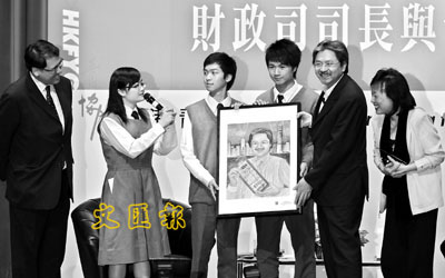 ■財政司司長曾俊華出席由香港青年協會主辦的與青年「真情對話」分享會,獲贈送畫像。本報記者高仲明 攝