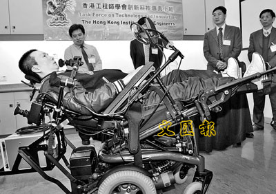 3年前,斌仔從美國購買現時使用的電動輪椅,當年售價約需10多、20萬元,買回來後還要根據他的需求進行改裝,現時他可利用下顎控制輪椅上的控制桿,將輪椅的腳架收起,變成一張活動床,讓輪椅使用者可平躺休息。