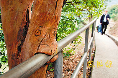 從嶼北老虎頭下山,沿行人徑將抵愉景灣寶峰途中,見有樹榦生長得頗有霸氣,緊貼著欄杆邊,最妙之處是有人在樹榦上塗鴉,繪以人面樣,好似張口將欄杆咬著,神來之筆,令人看到發笑。
