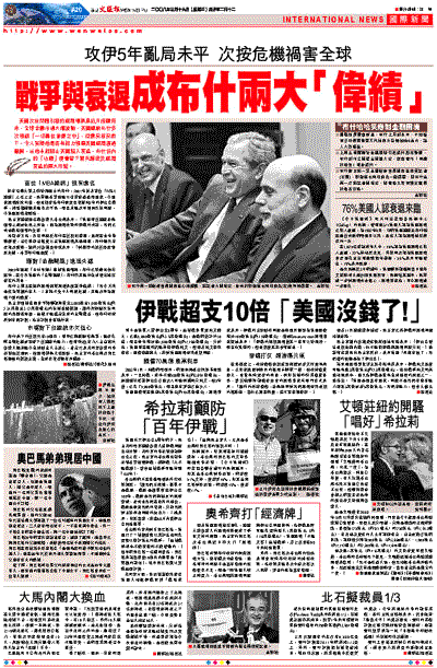 美國次按問題引發的經濟壞消息近月接踵而來,全球金融市場大幅波動,美國總統布什多次強調「一切盡在掌握之中」,但情況每況愈下,令人質疑他是否有能力領導美國經濟渡過難關,若他未能阻止美國陷入衰退,布什任內的「功績」便會留下窮兵黷武及經濟衰退的兩大污點。