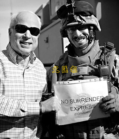 ■正在伊拉克訪問的麥凱恩與保護他的駐伊美軍少校合影。路透社