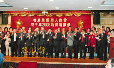 【本報訊】(記者 潘曉平)香港華僑華人總會日前假紅磡海逸皇宮酒樓舉行戊子年新春聯歡午宴,全國僑聯副主席、香港僑界社團聯會會長陳有慶,中聯辦協調部副部長周志榮蒞臨主禮。宴會筵開72席,香港40個友好社團的首長及各界嘉賓、會友近千人出席,華堂集慶、同賀新春。