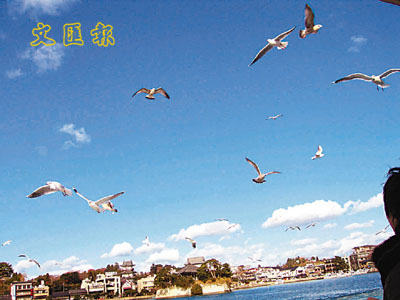 ■在松島環島遊期間,大群海鷗在等候船尾乘客餵飼食物。