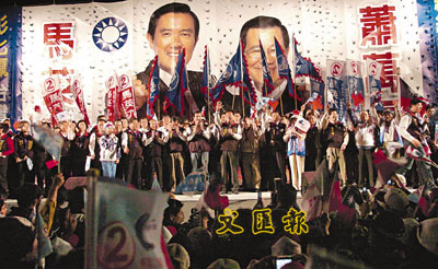 ■國民黨陣營19日在彰化舉辦大型造勢活動,現場許多民眾為馬英九和蕭萬長加油鼓勁。法新社