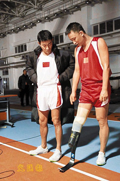 劉德華日前與中國殘疾人聯合會(簡稱中殘聯)拍攝公益廣告,希望藉由華仔的健康形象呼籲更多人加入、幫助並重視殘疾運動員。拍攝當天,導演組將演對手戲的殘疾運動員介紹給華仔,而這一位主角的來頭也不小,原來他是1996-2004年全國殘疾運動會200米25秒3的紀錄保持人,去年剛從運動場上退休的運動選手宋晨濤。對於從他最熱愛的運動場上退休,他表示:「原本對於無法參加這次北京的殘奧比賽覺得非常遺憾,但是能有機會和劉德華一起拍公益廣告,讓更多人了解殘疾人的拚搏精神,我感到很欣慰。」笑談之中,被問及百米紀錄的華仔說:「我百米最高紀錄是11秒3。」聽完,大家便異口同聲說:哇!那很不錯喔。華仔連忙說:「那是20年前了,現在大概是13秒左右。」而為了讓全世界的人都能重視殘疾運動員,導演還找了些不同人種(白人、黑人、黃種人)的外國人來充當演員。 ■文:Ivy