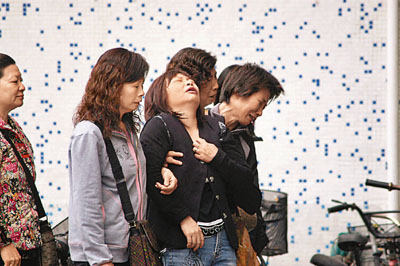 ■中二男生墮樓慘死,其母於路祭時悲傷痛哭,需親友攙扶。