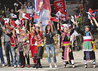 ■20日高雄,穿著原住民服飾的馬英九支持者在街頭舞動旗幟。美聯社