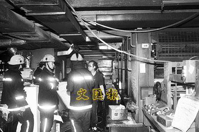 ■消防員在印刷廠內調查火警原因。本報記者蔣焯文 攝