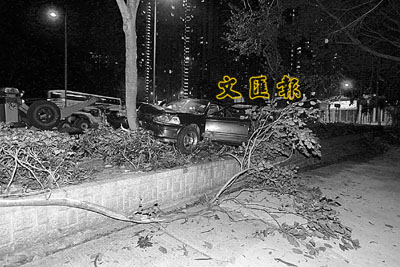 ■肇事私家車剷上花槽撼中一棵大樹才停下。