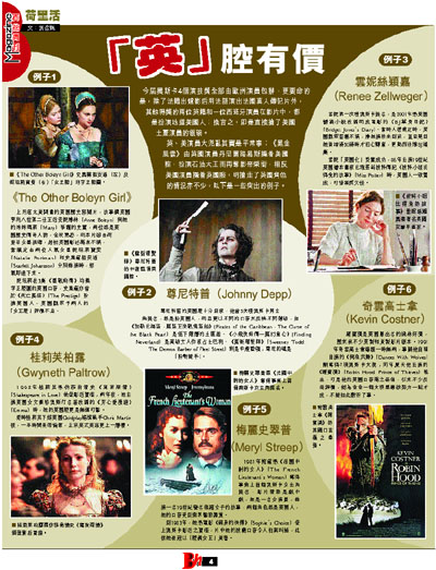 英、美演員大兜亂其實是平常事;《黑金風雲》由英國演員丹尼爾路易斯操著美國腔,扮演石油大王而再奪影帝榮銜,相反美國演員操著英國腔,明搶走了英國角色的情況亦不少,以下是一些突出的例子。