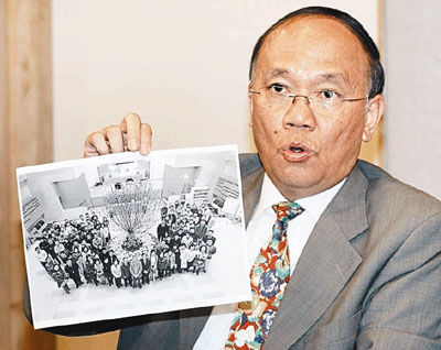 ■李鏡森在退休離任前,為房署建立一套新的電腦系統。他手持的照片是一起為新系統存入資料的同事。本報記者潘達文 攝