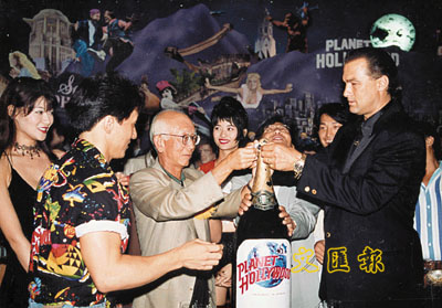 這一照,是一九九○年鄒文懷和成龍都有份投資的美式餐廳「繽麗荷里活」(PLANET HOLLYWOOD)在尖沙咀海運大廈地牢開幕,由於發起人是史泰龍、阿力舒華辛力加和布斯韋利士三個巨星,開幕之夜有荷理活巨星級的史提芬史葛專程來剪綵道賀,成龍和鄒文懷兩個香港地膽股東,當然敬酒大表歡迎,筆者阿杜是當然唯一攝記。