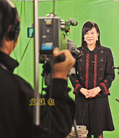 ■伍穎梅在RoadShow的錄影室內示範如何「上鏡」。 本報記者葉傲冬 攝
