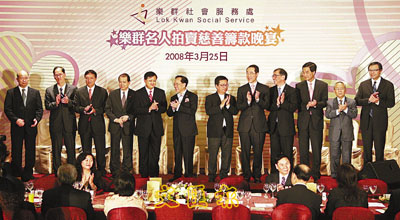 【本報訊】(記者 沈清麗) 樂群社會服務處昨晚首次舉辦「樂群名人拍賣慈善籌款晚宴」,宴會在金鐘萬豪酒店舉行,得到城中官紳名流踴躍支持。香港特區行政長官曾蔭權、政務司司長唐英年任開幕式主禮嘉賓。民政事務局局長曾德成、勞工及福利局局長張建宗、中聯辦港島工作部部長李正慈亦有出席晚宴。