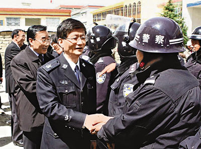 ■孟建柱看望、慰問身處前線的武警及公安民警,並與他們握手。 網上圖片