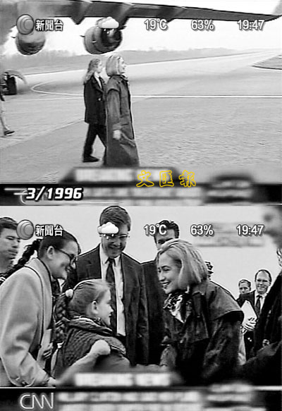 ■香港有線新聞畫面顯示,當年希拉莉抵達波斯尼亞,與女兒切爾西從容落機(上),稍後又停下來與前來接機的波斯尼亞女童交談(下)。