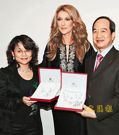 加拿大天后級歌手莎蓮迪安(中),昨日獲周大福贊助上海站及北京站演唱會佩戴的「CHOW TAI FOOK Fine Jewellery」系列首飾,當莎蓮從高層手中接過價值逾千萬元的首飾時,這位國際天后即時顯得愛不釋手,看來樂壇天后跟鑽飾的確是最佳配搭。 ■文:炸/圖:中新社