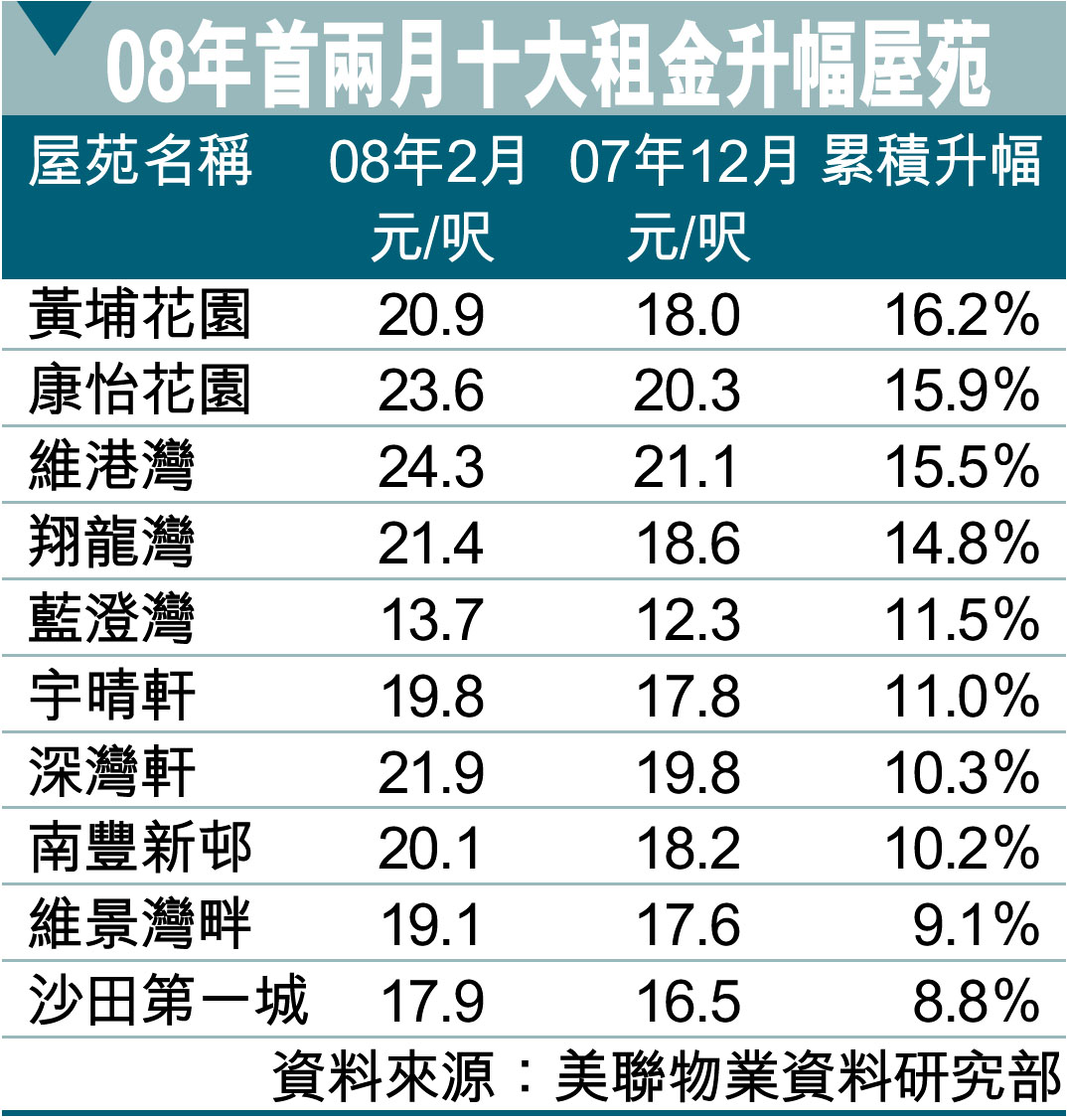 08年首兩月十大租金升幅屋苑