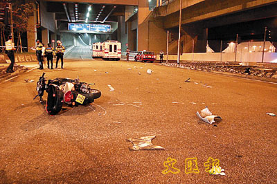 【本報訊】長沙灣連翔道與東京街西十字路口,昨晚9時40分發生奪命車禍。一名男子駕駛綿羊仔電單車,沿東京街西行,途至連翔道十字路口,遇上一輛載有一名女乘客之的士沿連翔道西行而至,懷疑其中一方衝燈,電單車失事「攔腰」撞向的士左邊車身,鐵騎士凌空飛起,被拋到10米遠倒地重傷不起,頭盔飛脫。警方接報與救護員到場時,鐵騎士已陷入昏迷,另的士女乘客亦受了輕傷,同被送往醫院救治,惟鐵騎士抵院不久後被證實不治。