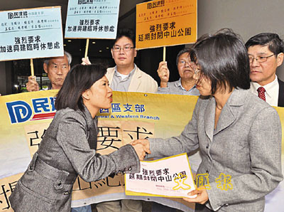 民建聯中西區支部代表昨日到上環海港政府大樓遞交請願信,由康樂及文化事務署的代表(右)接收,要求開放中山公園的臨時休憩處,減低對市民的影響。本報記者李志樑 攝
