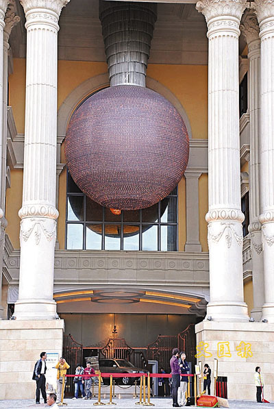 秀外慧中 「我在十六浦水晶球下邊等你啊。」一位遊客在十六浦門前和朋友通電話。抬頭望去,一個直徑達數十米,以水晶吊墜串成的球形燈飾懸掛在娛樂場入口處。水晶球不停變幻著迷人的色彩,由浪漫的紫色悄然轉變成綠色、紅色,都說賭場布局講究風水,雖無法驗證碩大的水晶球是否為風生水起的神秘風水物,但它已成為這間新張不久的娛樂場的重要標誌。