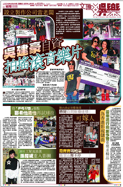 昨日見吳建豪蓄鬚,他笑言自己是無聊才改變形象。其實之前他一直休息,個多月來到了美國探望家人,不過他即將投入錄音工作,計劃於年中推出新專輯,八月份自己開設Smash and grab電影製作公司,投資開拍一部搖滾音樂電影,編、導均由洪金寶兒子洪天祥負責,是齣兄弟情誼的電影,吳建豪當老闆及演出,戲中還他要演繹大量歌曲,並將會到美國及台灣取景。至於會否找舊拍檔F4演出,他表示各有各忙,應該是不會了。