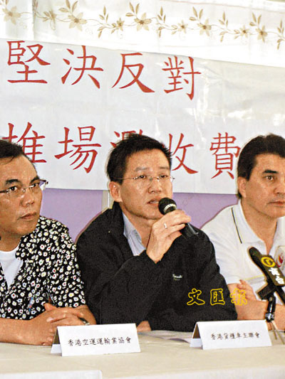 落馬洲中港貨運聯會主席蔣志偉說,全港去年2,400萬個標準貨櫃,除了7成由葵涌貨櫃碼頭處理外,其餘逾700萬個貨櫃經由外圍貨櫃堆場處理。全港24個外圍貨櫃堆場中,有20個會在4月1日強行徵收每車次10元的進出場管理費。