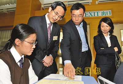 ■「第二屆香港杯外交知識競賽」初賽昨舉行,楊子剛(左二)特別到場視察為學生打氣。右一為明天更好基金行政總裁鄧淑德,右二為教育局首席教育主任容寶樹。本報記者李志樑 攝