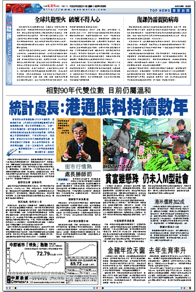 香港綜合消費物價指數(CPI)月月創新高,通脹持續升溫,2月份綜合消費物價指數更打破金融風暴後紀錄,較去年同期激增6.3%,比對一月份亦激增近倍。統計處處長馮興宏表示,香港現時通脹9成由食物及租金加幅帶動,預期通脹上升將會持續幾年,不會短期內消失﹔但他強調,香港於80至90年代通脹曾達雙位數,故現時通脹仍不算嚴重,加上政府差餉寬免、電費回贈等措施,已收一定紓緩作用,政府未來最應關顧低收入人士如何渡過通脹難關。