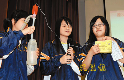 【本報訊】(記者 陳倩筠)爛喉管、舊鬧鐘、鐵線、飲用過後的膠汽水樽、裝修後棄置的電線管,本是一堆毫不起眼的物料,但靠著一班中學生的創意及對環保的熱誠,竟然可以化腐朽為神奇,製造出「環保水位感應器」,提醒用家「關水掣」;另外,又能變身按摩器,令人嘖嘖稱奇。上述小發明分別在「中學校際環保產品比賽」中勇奪冠軍及優異獎。